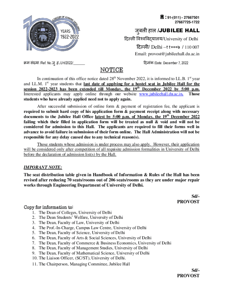 91(011) 27667501 276677251722 /JUBILEE HALL /University of Delhi/ Delhi / 110 007 Email: provost@jubileehall.du.ac.in /Ref. No. ./JR/2022/___ /Date: December 7, 2022NOTICEIn continuation of this office