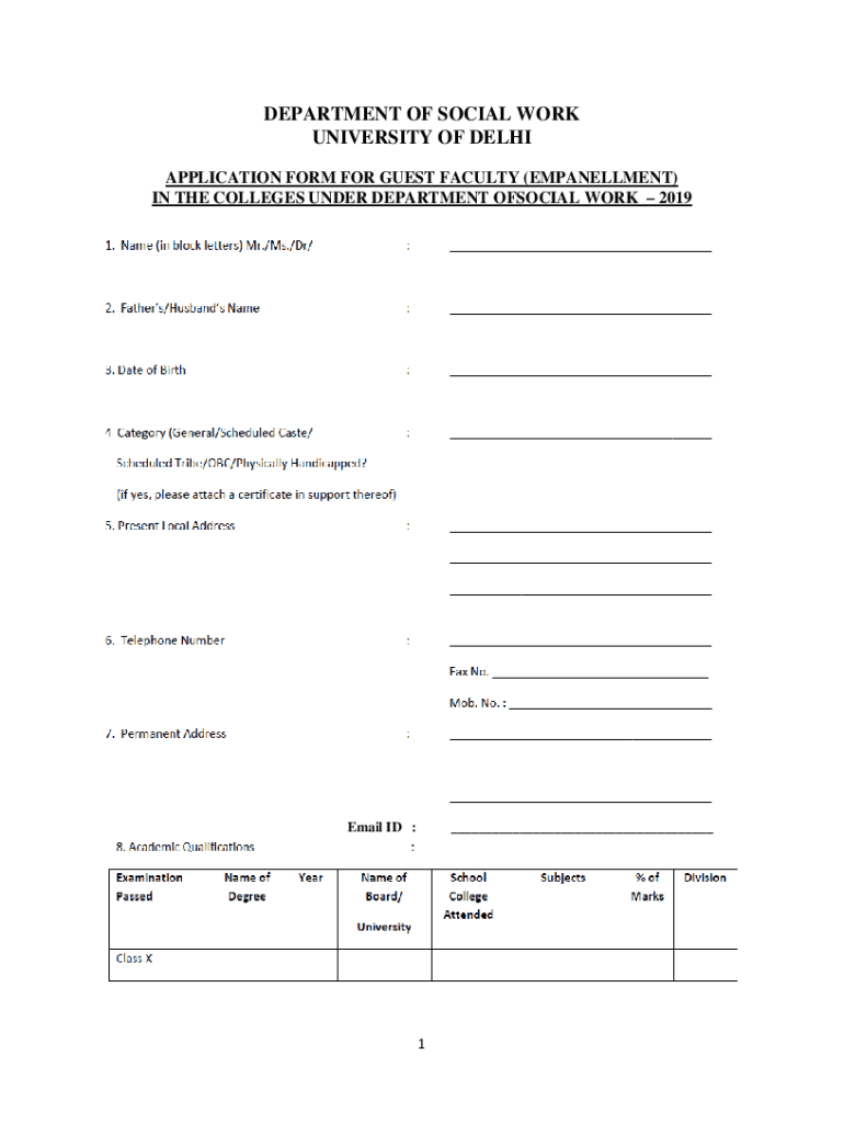 DEPARTMENT OF SOCIAL WORK UNIVERSITY OF DELHI APPLICATION FORM FOR GUEST FACULTY (EMPANELLED) IN THE COLLEGES UNDER DEPARTMENT OFFICIAL WORK 2019Email ID :___1 2 13. Total teaching experience:___