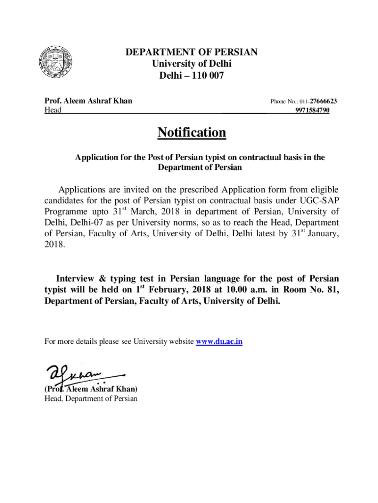 DEPARTMENT OF PERSIAN University of Delhi 110 007 Prof. Ale em Ashraf Khan Headphone No.: 01127666623___9971584790Notification Application for the Post of Persian typist on contractual basis in the