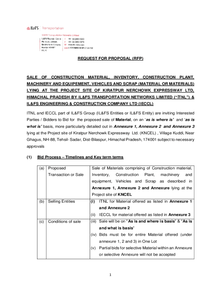 REQUEST FOR PROPOSAL (RFP)SALE OF CONSTRUCTION MATERIAL, INVENTORY, CONSTRUCTION PLANT, MACHINERY AND EQUIPMENT, VEHICLES AND SCRAP (MATERIAL OR MATERIALS) LYING AT THE PROJECT SITE OF KANPUR VIRCHOW