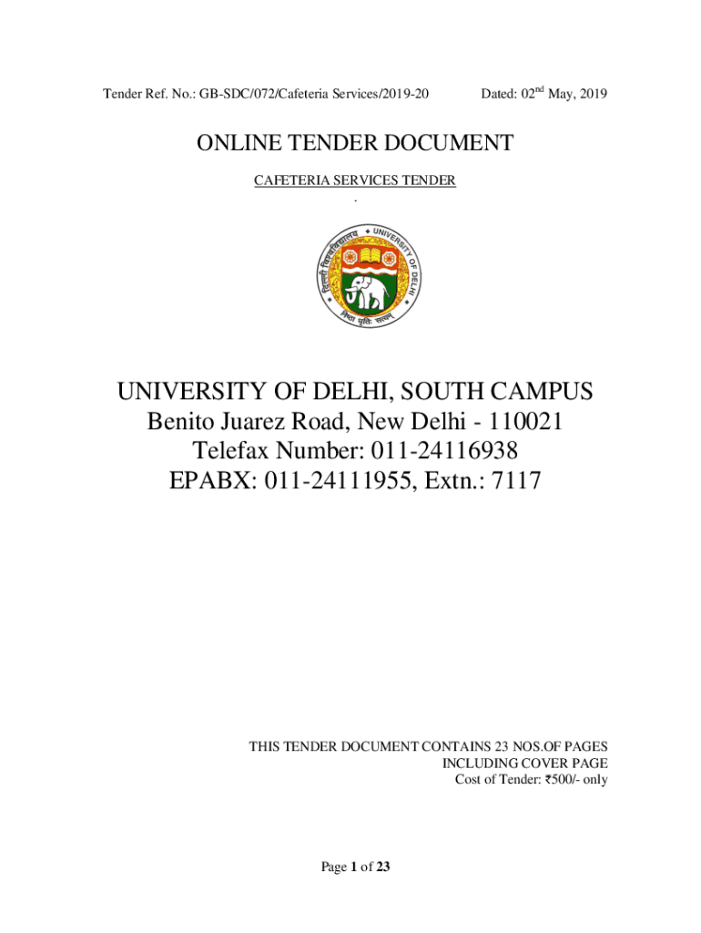 Tender Ref. No.: GB SDC/072/Cafeteria Services/201920Dated: 02nd May, 2019ONLINE TENDER DOCUMENT CAFETERIA SERVICES TENDER.UNIVERSITY OF DELHI, SOUTH CAMPUS Benito Juárez Road, New Delhi 110021 Telefax