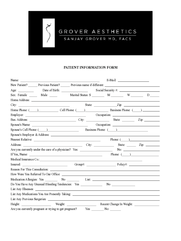 !PATIENT INFORMATION FORM Name: ___Email:New Patient? ___ Previous Patient? ___ Previous name if different: Age: ___ Sex: Female ___Date of Birth: ___ Male ___Social Security #:Marital Status: S ___M