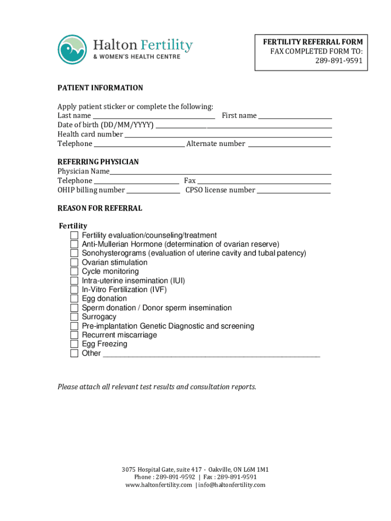 FERTILITY REFERRAL FORM FAX COMPLETED FORM TO: 2898919591 PATIENT INFORMATION Apply patient sticker or complete the following: Last name ___ First name ___ Date of birth (DD/MM/YYY) ___ Health card