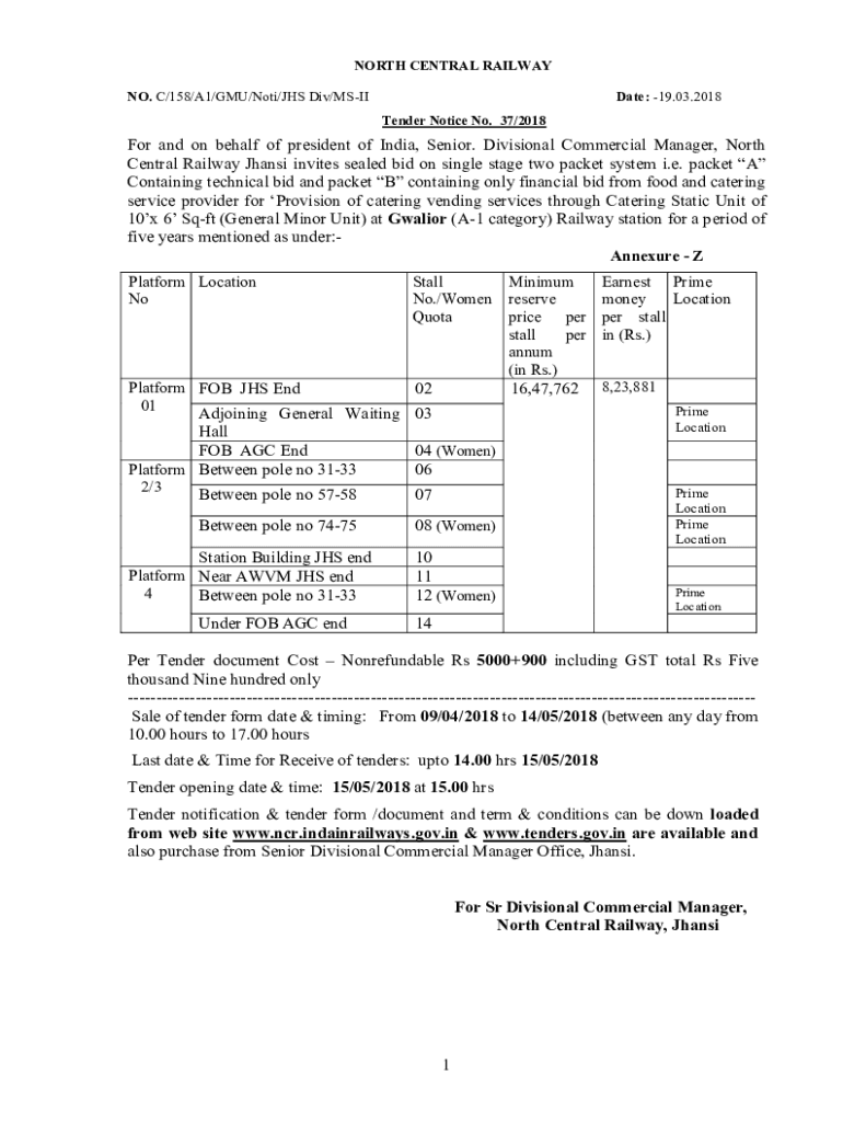NORTH CENTRAL RAILWAY NO. C/158/A1/GMU/Not/JHS Div/Estimate: 19.03.2018 Tender Notice No. 37/2018For and on behalf of president of India, Senior. Divisional Commercial Manager, North Central Railway