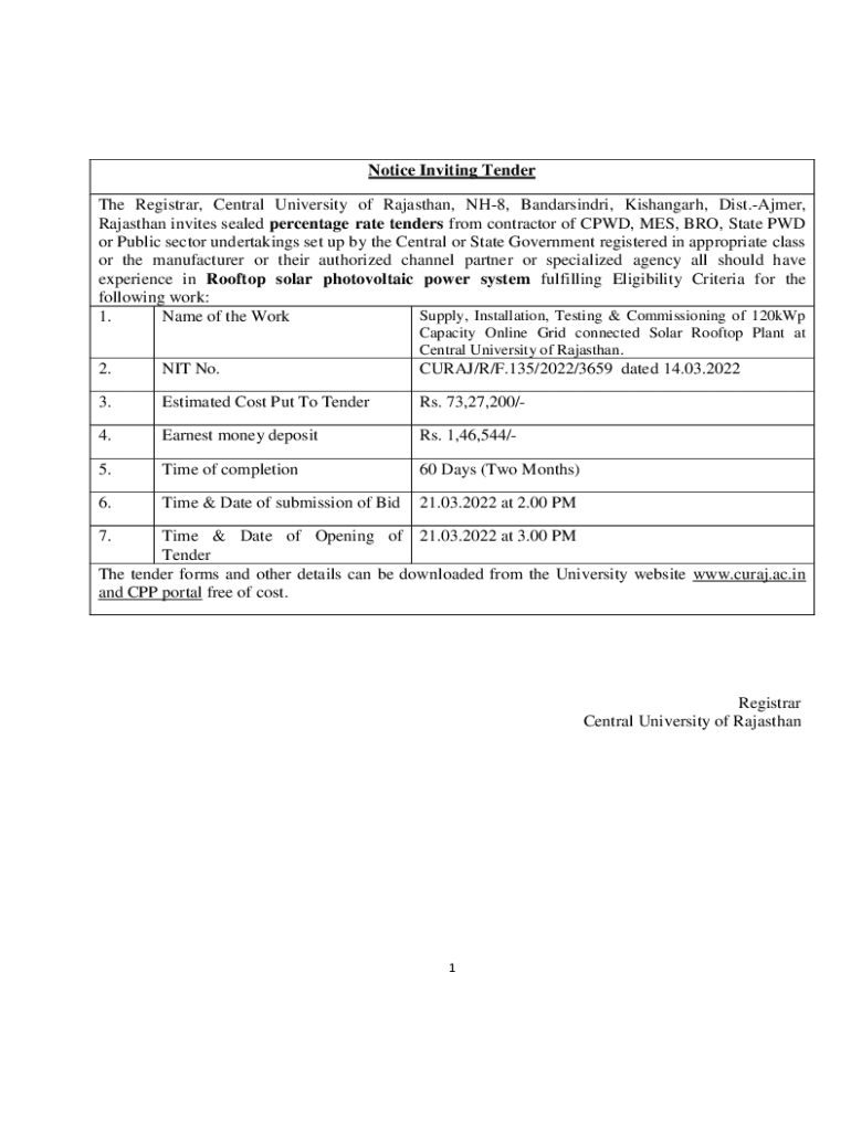 Get the free Notice Inviting Tender - Central University of Rajasthan