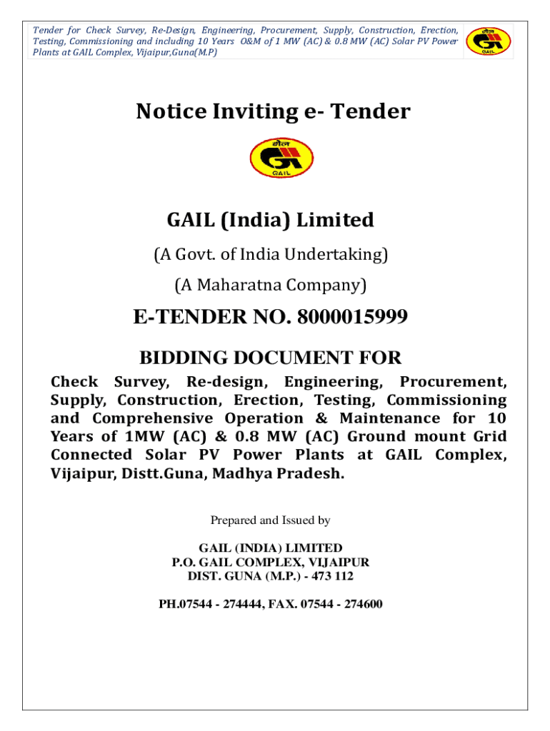 Tender for Check Survey, Redesign, Engineering, Procurement, Supply, Construction, Erection, Testing, Commissioning and including 10 Years O&M of 1 MW (AC) & 0.8 MW (AC) Solar PV Power Plants at GAIL