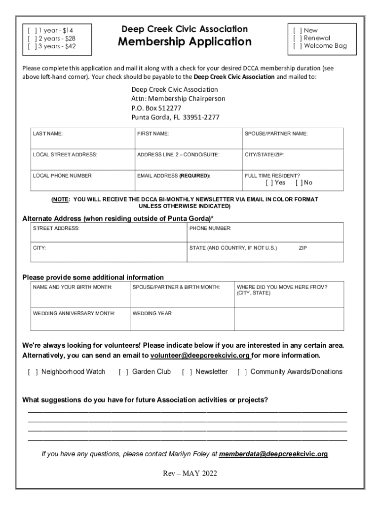 [ ] 1 year $14 [ ] 2 years $28 [ ] 3 years $42Deep Creek Civic Association[ ] New [ ] Renewal [ ] Welcome Membership ApplicationPlease complete this application and mail it along with a check for