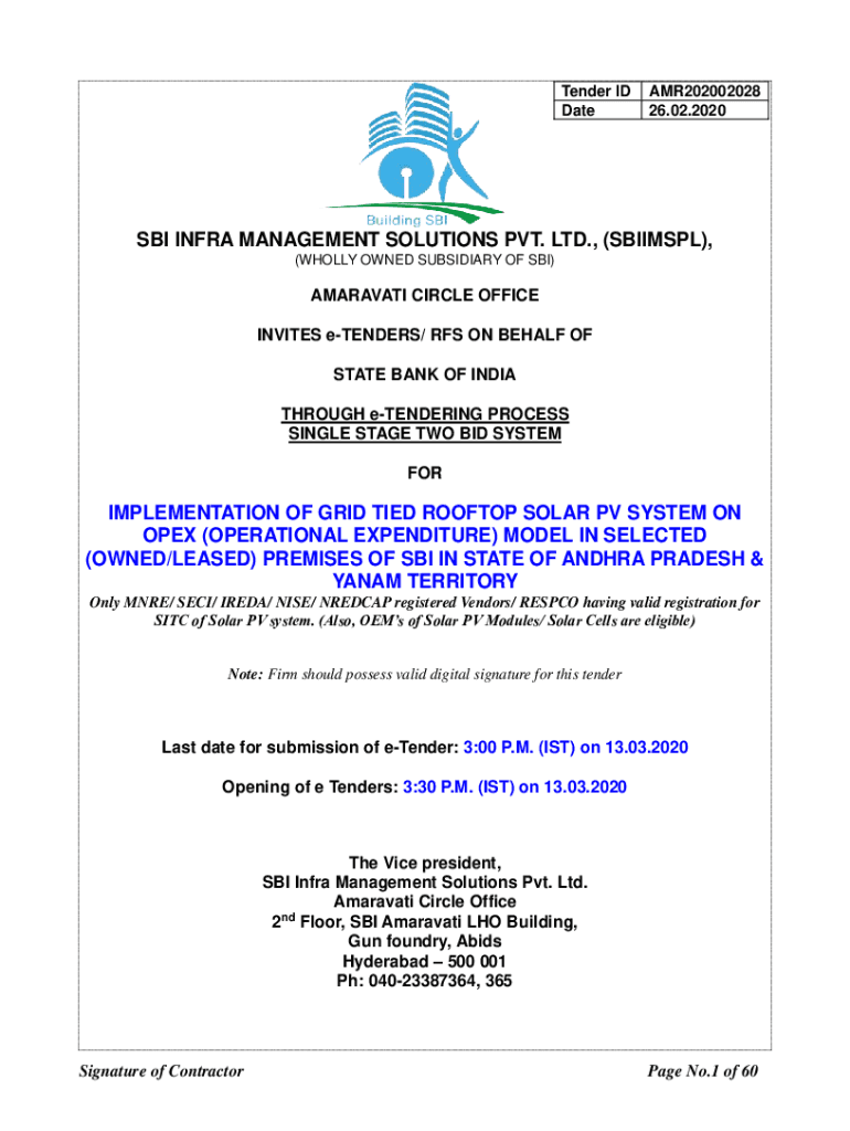 Tender ID DateAMR202002028 26.02.2020SBI INFRA MANAGEMENT SOLUTIONS PVT. LTD., (SBIIMSPL), (WHOLLY OWNED SUBSIDIARY OF SBI)AMARAVATI CIRCLE OFFICE INVITES tenders/ RFS ON BEHALF OF STATE BANK OF INDIA