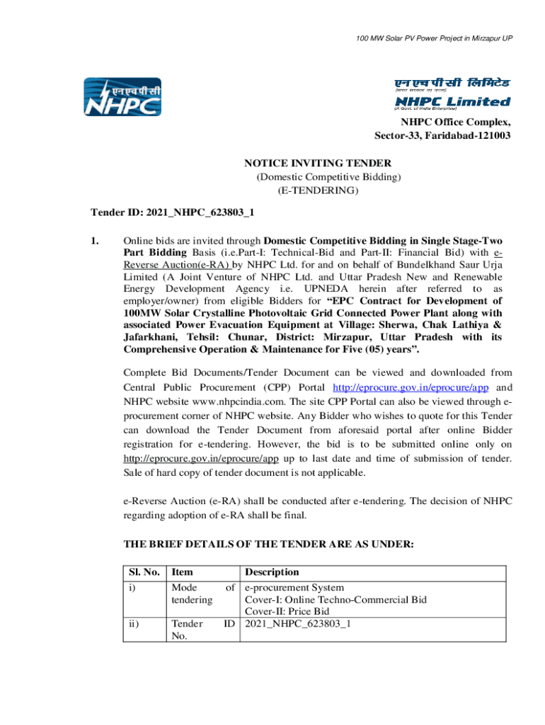 100 MW Solar PV Power Project in Mirzam UPN HPC Office Complex, Sector33, Faridabad121003 NOTICE INVITING TENDER (Domestic Competitive Bidding) (TENDERING) Tender ID: 2021_NPC_623803_1 1. Online bids