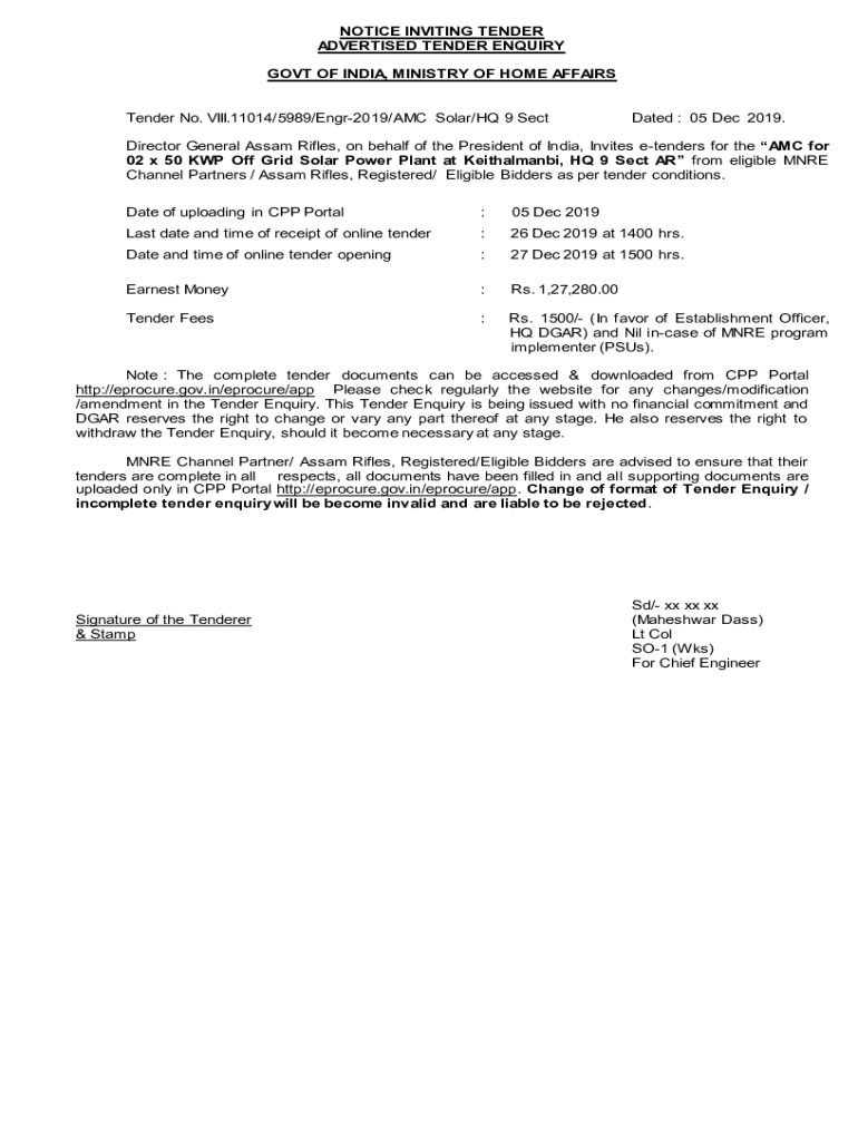 NOTICE INVITING TENDER ADVERTISED TENDER Inquiry GOVT OF INDIA, MINISTRY OF HOME AFFAIRS Tender No. VIII.11014/5989/Engr2019/AMC Solar/HQ 9 Sedated : 05 Dec 2019. Director General Assam Rifles, on