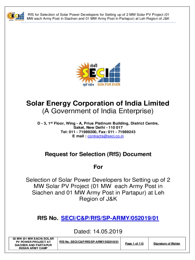 RFS for Selection of Solar Power Developers for Setting up of 2 MW Solar PV Project (01 MW each Army Post in Kitchen and 01 MW Army Post in Partaker) at Led Region of Solar Energy Corporation of India