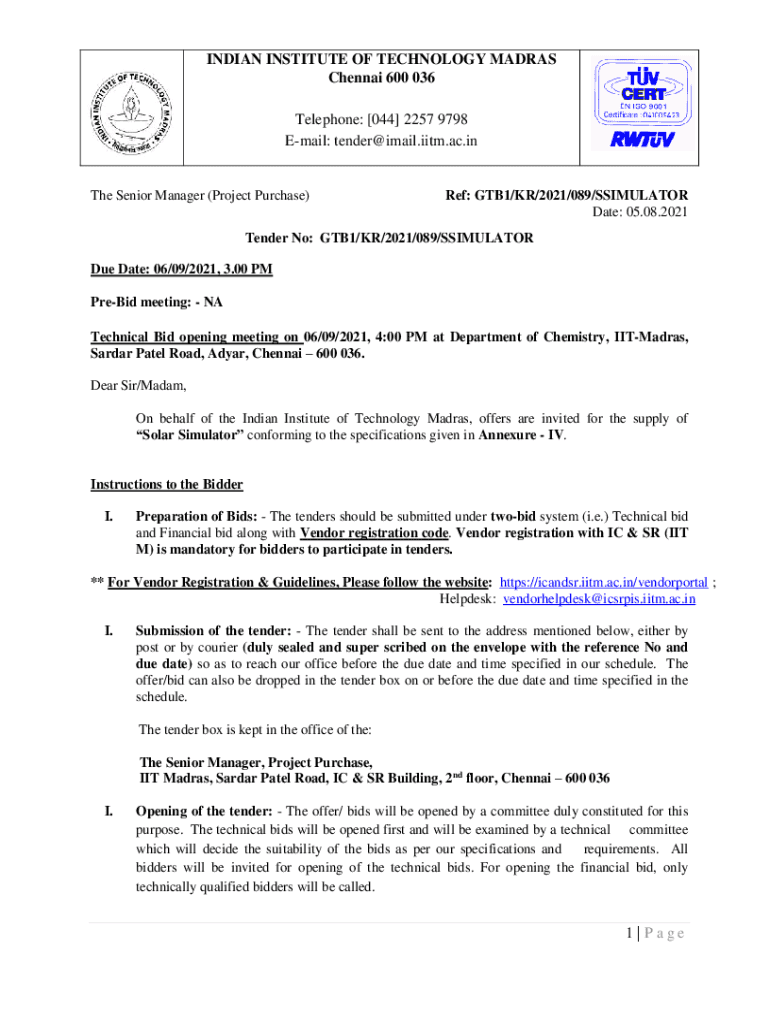 INDIAN INSTITUTE OF TECHNOLOGY MADRAS Chennai 600 036 Telephone: [044] 2257 9798 Email: tender@imail.iitm.ac.inThe Senior Manager (Project Purchase)Ref: GTB1/KR/2021/089/SIMULATOR Date: 05.08.2021Tender