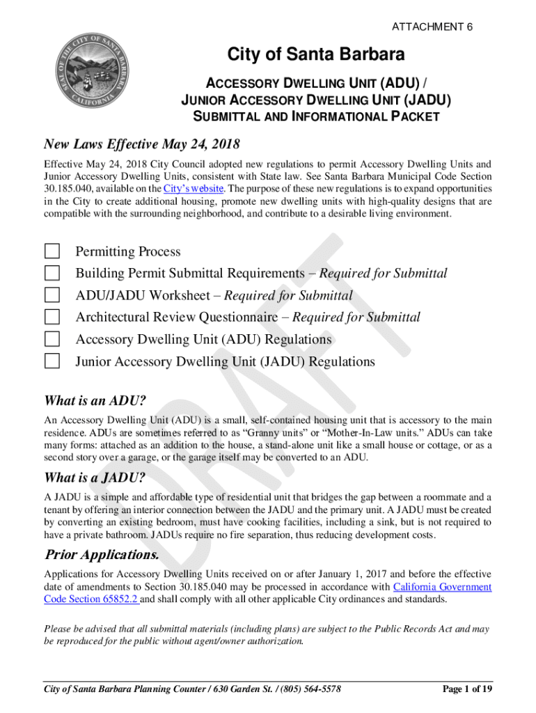 ATTACHMENT 6City of Santa Barbara ACCESSORY DWELLING UNIT (ADU) / JUNIOR ACCESSORY DWELLING UNIT (JADE) SUBMITTAL AND INFORMATIONAL PACKET New Laws Effective May 24, 2018, Effective May 24, 2018,