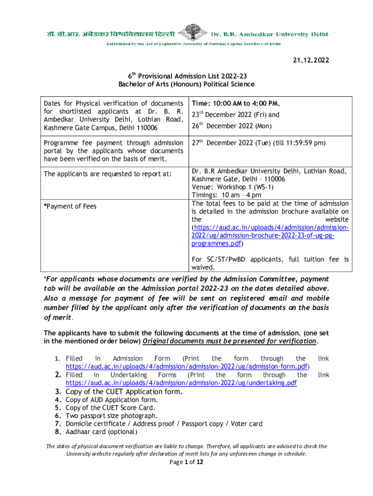 21.12.2022 6th Provisional Admission List 202223 Bachelor of Arts (Honors) Political Science Dates for Physical verification of documents for shortlisted applicants at Dr. B. R. Amber University Delhi,