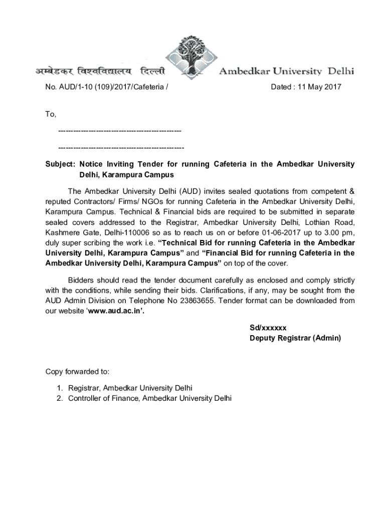 No. AUD/110 (109)/2017/Cafeteria /Dated : 11 May 2017To, Subject: Notice Inviting Tender for running Cafeteria in the Amber University Delhi, Paramour Campus The Amber University Delhi (AUD) invites