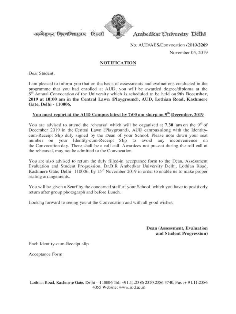 No. AUD/AES/Convocation /2019/2269 November 05, 2019, NOTIFICATION Dear Student, I am pleased to inform you that on the basis of assessments and evaluations conducted in the program that you had enrolled