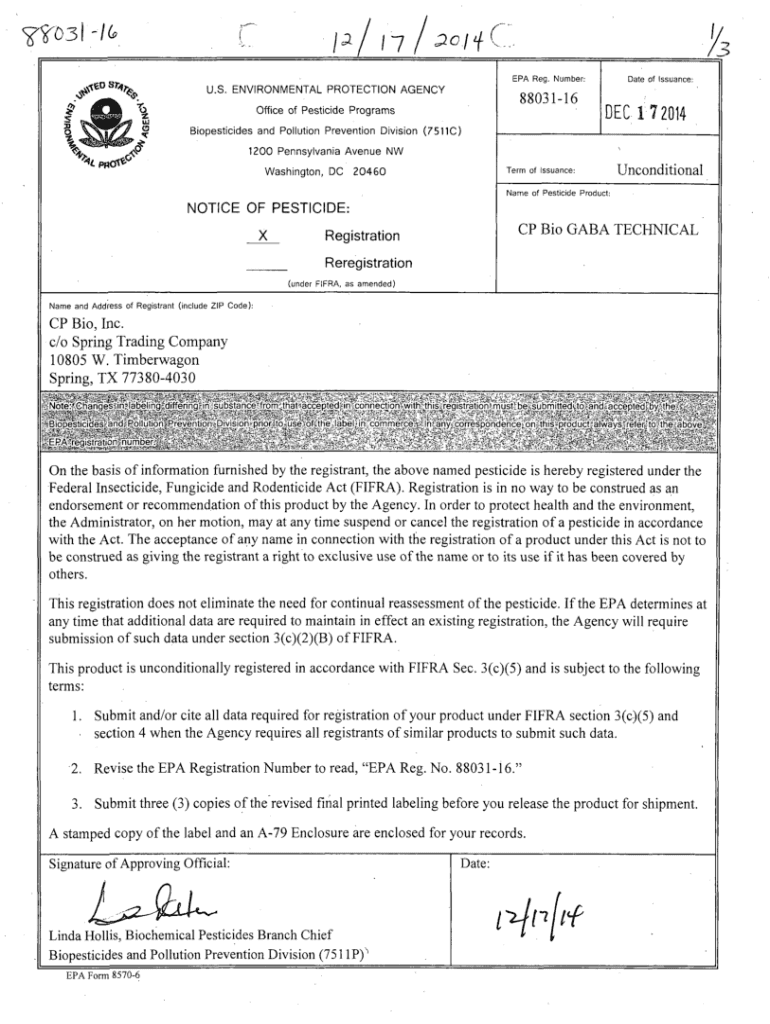 50/Y r\” Folk\'\'3 EPA Reg. Number:U.S. ENVIRONMENTAL PROTECTION AGENCY8803116Office of Pesticide ProgramsDate of Issuance:DEC 1 72014Biopesticides and Pollution Prevention Division (7511C) 1200