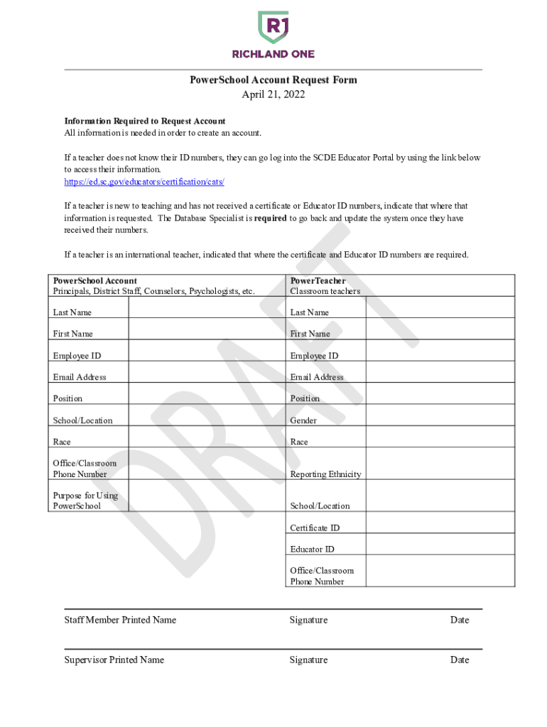 PowerSchool Account Request Form April 21, 2022, Information Required to Request Account All information is needed in order to create an account. If a teacher does not know their ID numbers, they