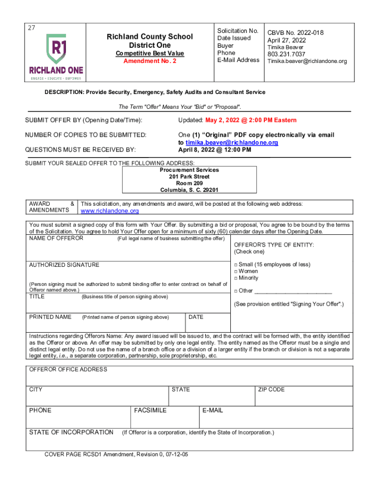 27Solicitation No. Date Issued Buyer Phone Email AddressRichland County School District One Competitive Best Value Amendment No. 2CBVB No. 2022018 April 27, 2022, Tamika Beaver803.231.7037Timika.beaver@richlandone.orgDESCRIPTION: