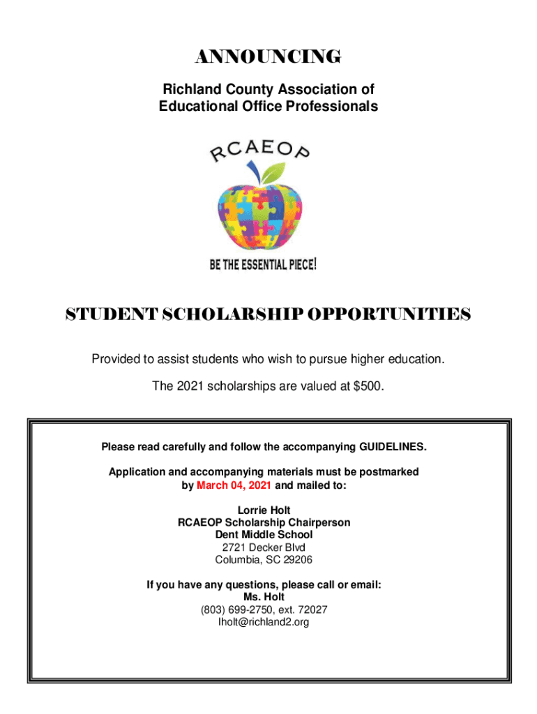 ANNOUNCING Richland County Association of Educational Office ProfessionalsSTUDENT SCHOLARSHIP OPPORTUNITIES Provided to assist students who wish to pursue higher education. The 2021 scholarships are