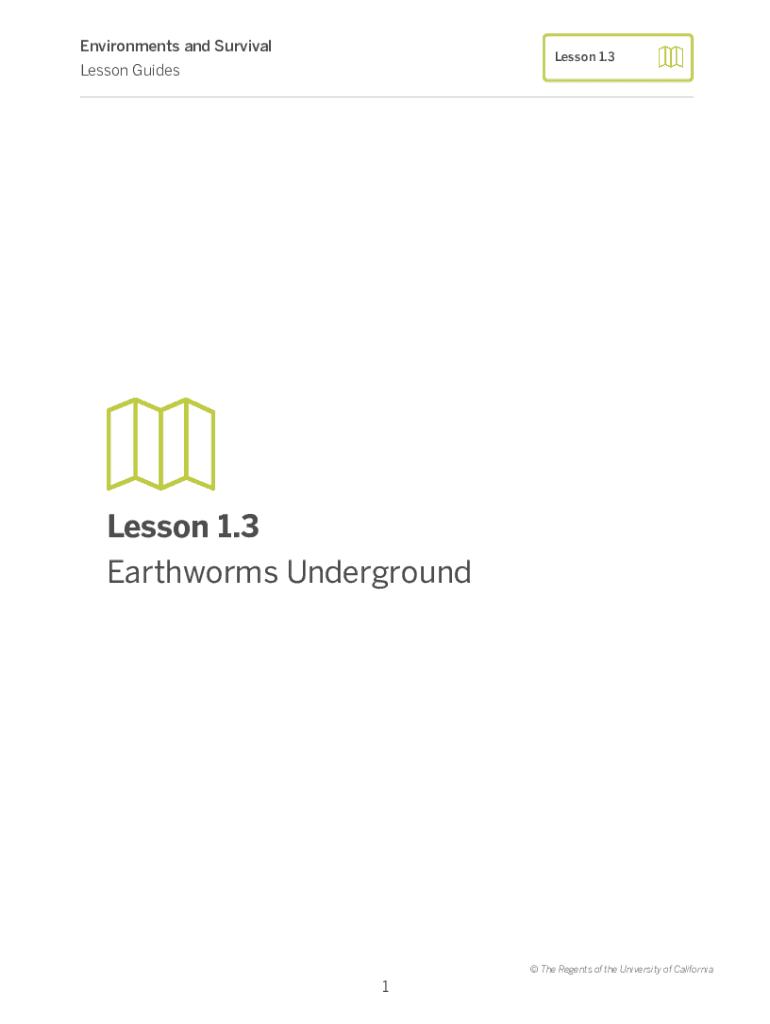 Environments and SurvivalLesson 1.3Lesson GuidesLesson 1.3 Earthworms Underground The Regents of the University of California1Environments and SurvivalLesson 1.3Lesson GuidesLesson Overview Students