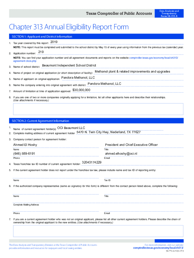 Texas Comptroller of Public AccountsData Analysis and Transparency Form 50772AChapter 313 Annual Eligibility Report Form SECTION 1: Applicant and District Information 1. Tax year covered by this report:2019