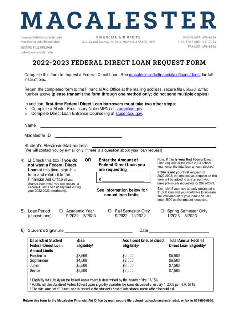 20222023 FEDERAL DIRECT LOAN REQUEST FORM Complete this form to request a Federal Direct Loan. See macalester.edu/financialaid/loans/direct for full instructions. Return the completed form to the