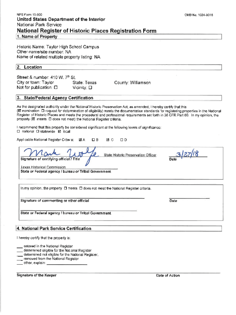 United States Department of the Interior National Park Service / National Register of Historic Places REGISTRATION FORM NPS Form 10900 OMB No. 10240018Taylor High School Campus, Taylor, Williamson