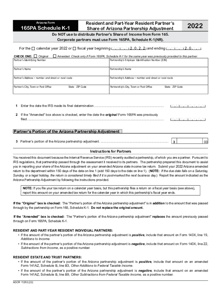 Resident and Part Year Resident Partners Share of Arizona Partnership Adjustment Arizona Form165PA Schedule K12022Do NOT used to distribute Partners Share of Income from Form 165. Corporate partners