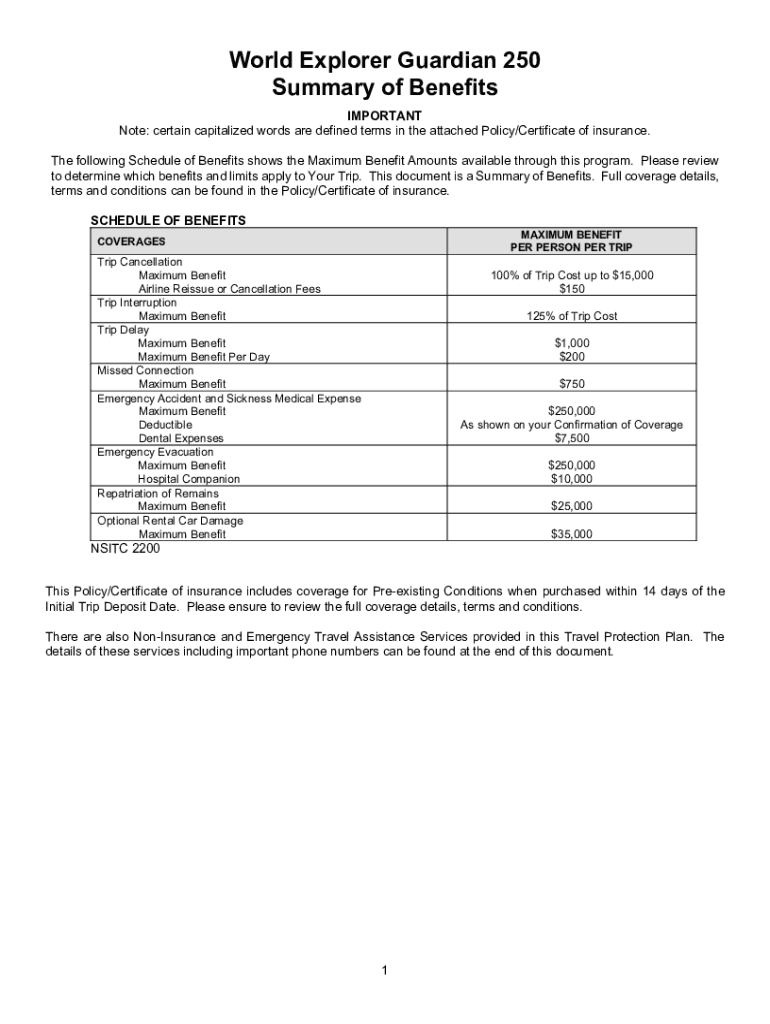 World Explorer Guardian 250 Summary of Benefits IMPORTANT Note: certain capitalized words are defined terms in the attached Policy/Certificate of insurance. The following Schedule of Benefits shows