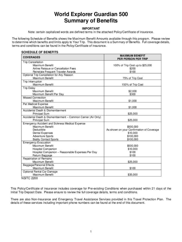 World Explorer Guardian 500 Summary of Benefits IMPORTANT Note: certain capitalized words are defined terms in the attached Policy/Certificate of insurance. The following Schedule of Benefits shows
