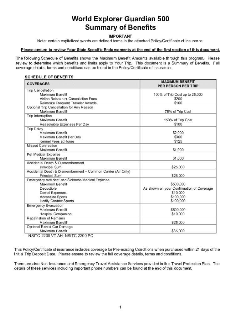 World Explorer Guardian 500 Summary of Benefits IMPORTANT Note: certain capitalized words are defined terms in the attached Policy/Certificate of insurance. Please ensure to review Your State Specific