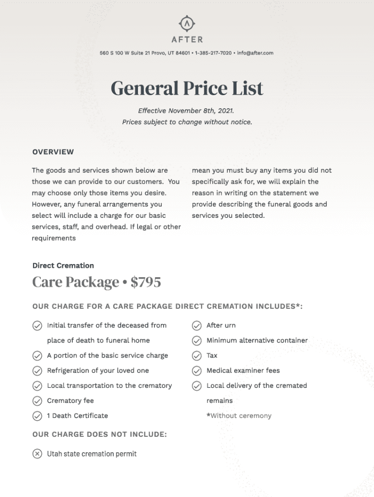 560 S100 W Suite 21 Provo, UT 84601 13852177020 info@after.comGeneral Price List Effective November 8th, 2021. Prices subject to change without notice. OVERVIEW The goods and services shown below