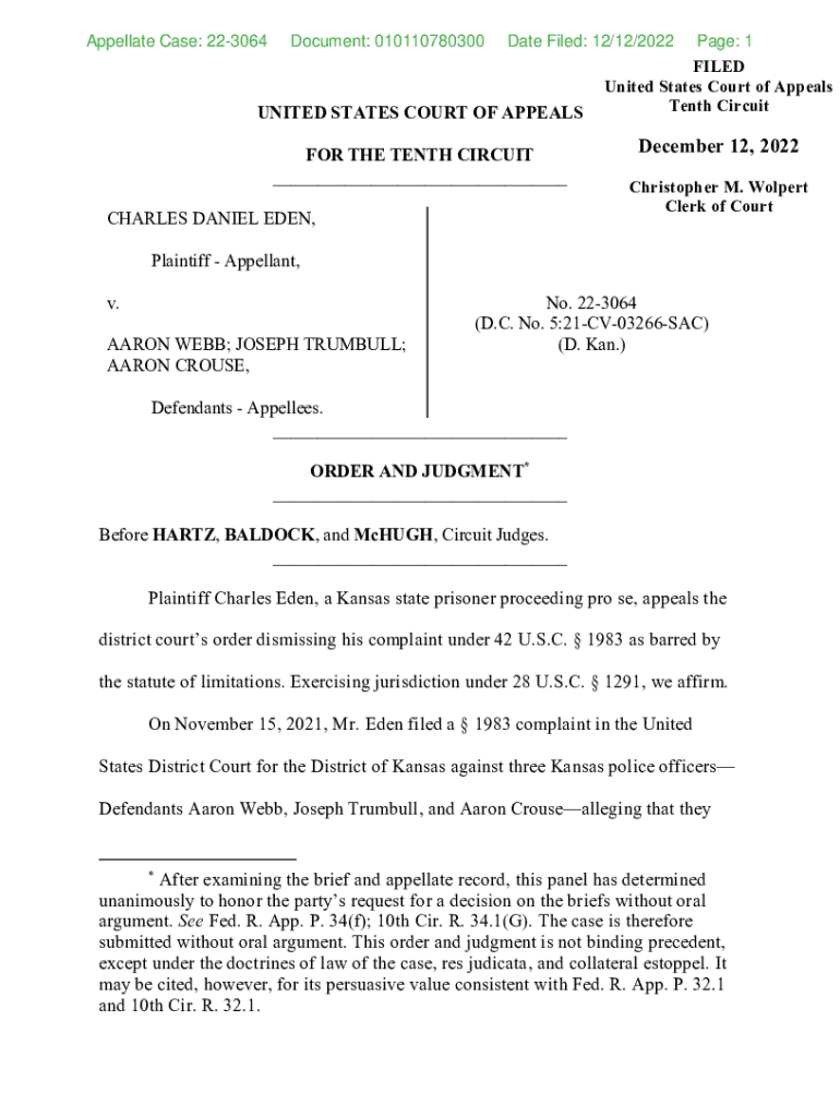 Appellate Case: 223064Document: 010110780300Date Filed: 12/12/2022UNITED STATES COURT OF APPEALS FOR THE TENTH CIRCUIT ___ CHARLES DANIEL EDEN, Page: 1FILED United States Court of Appeals Tenth Circuit