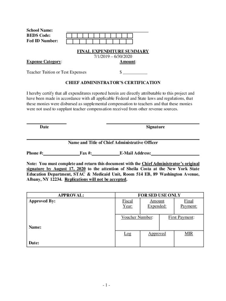 School Name: BEDS Code: Fed ID Number:Expense Category:___FINAL EXPENDITURE SUMMARY 7/1/2019 6/30/2020 Amount:Teacher Tuition or Test Expenses ___CHIEF ADMINISTRATORS CERTIFICATION I hereby certify