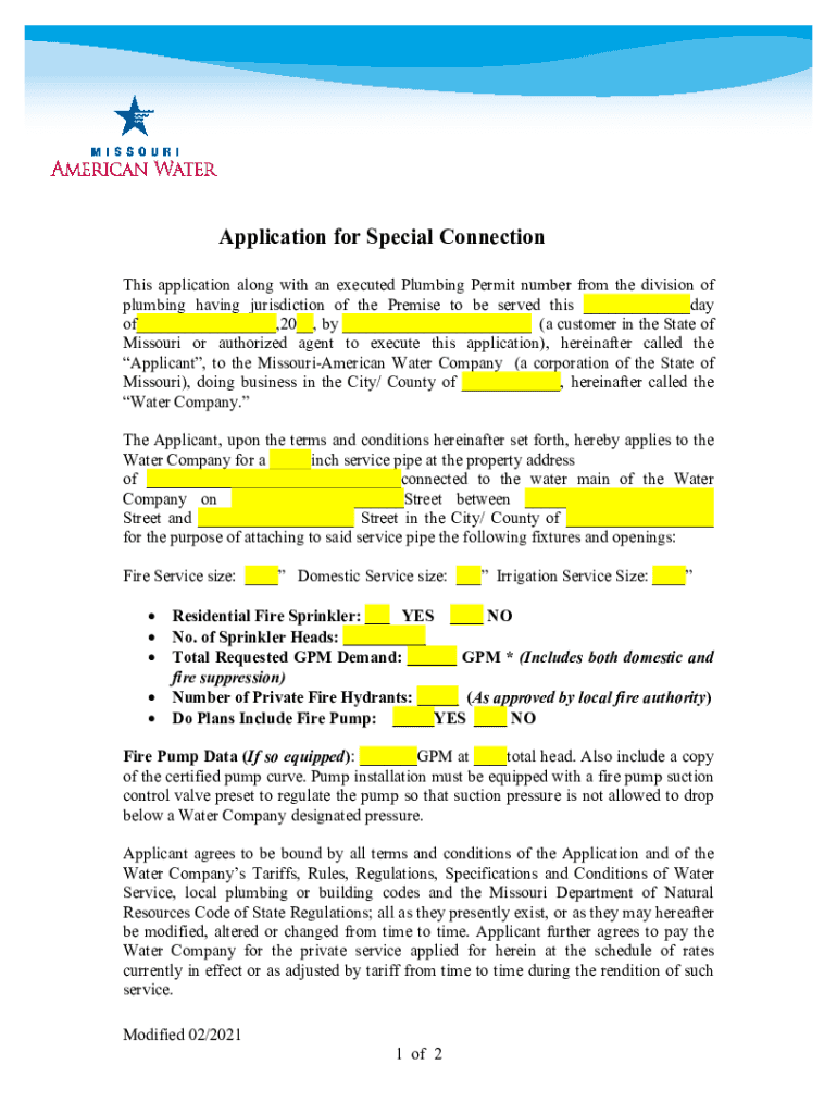 Application for Special Connection This application along with an executed Plumbing Permit number from the division of plumbing having jurisdiction of the Premise to be served this ___day of___,20__,