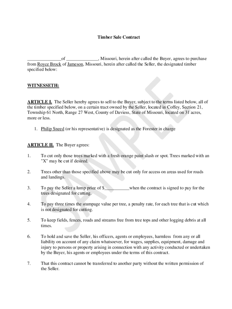 Timber Sale Contract___of ___, Missouri, herein after called the Buyer, agrees to purchase from Royce Brock of Jameson, Missouri, herein after called the Seller, the designated timber specified below:WITNESSED:ARTICLE