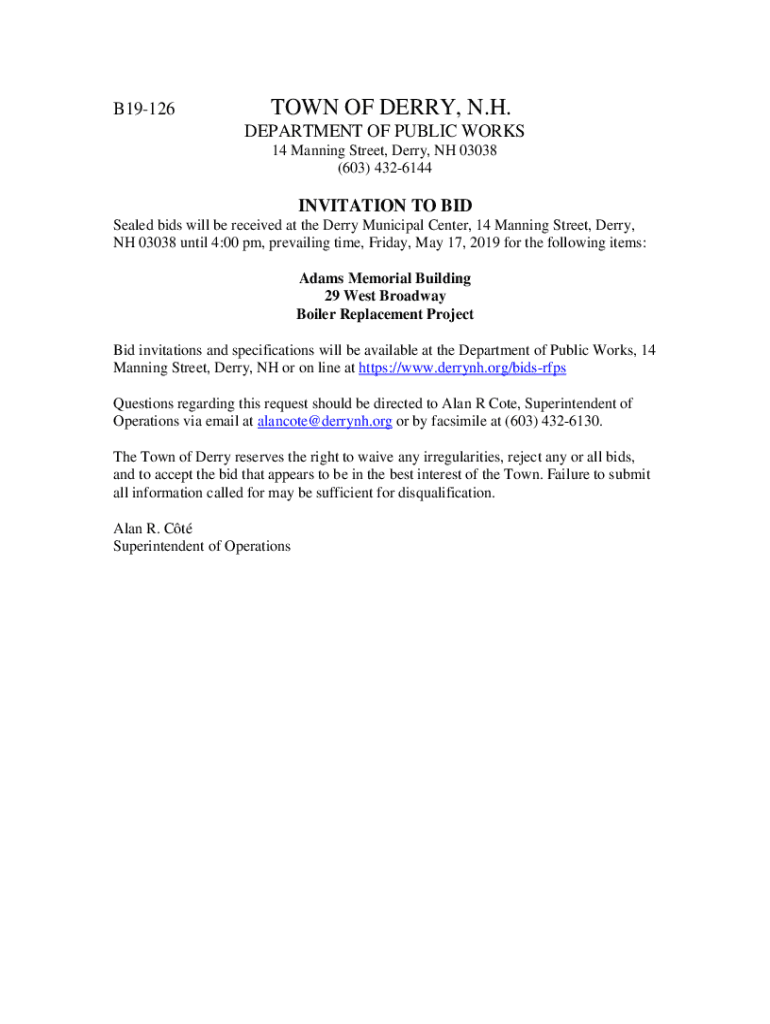B19126TOWN OF DERRY, N.H. DEPARTMENT OF PUBLIC WORKS 14 Manning Street, Derry, NH 03038 (603) 4326144INVITATION TO BID Sealed bids will be received at the Derry Municipal Center, 14 Manning Street,