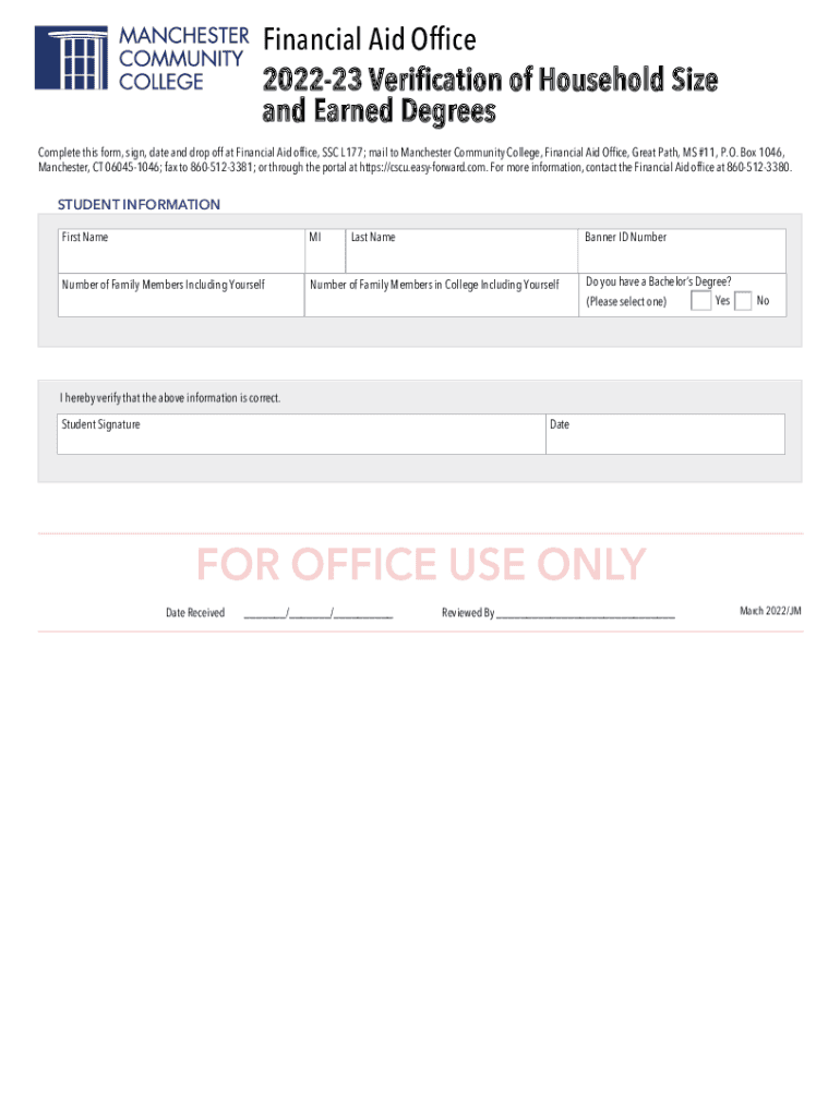 Financial Aid Office 202223 Variation of Household Size and Earned Degrees Complete this form, sign, date and drop off at Financial Aid office, SSC L177; mail to Manchester Community College, Financial