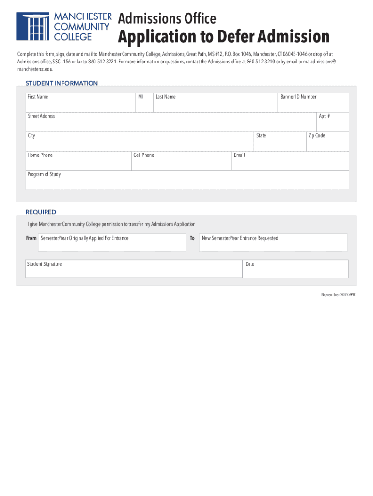 Admissions OffceApplication to Defer Admission Complete this form, sign, date and mail to Manchester Community College, Admissions, Great Path, MS #12, P.O. Box 1046, Manchester, CT 060451046 or drop