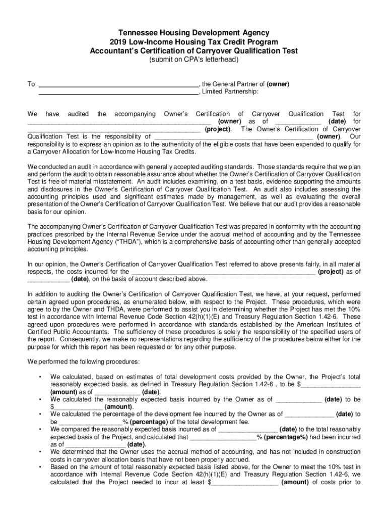 Tennessee Housing Development Agency 2019 Income Housing Tax Credit Program Accountants Certification of Carryover Qualification Test (submit on CPA\'s letterhead) To, the General Partner of (owner),