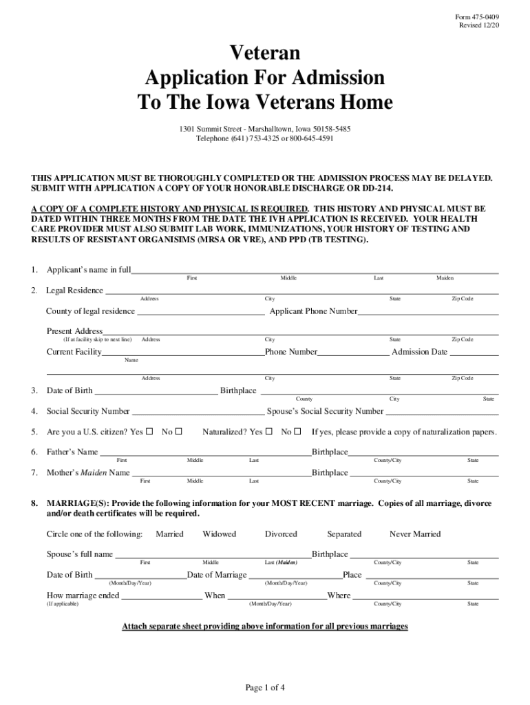 Form 4750409 Revised 12/20Veteran Application For Admission To The Iowa Veterans Home 1301 Summit Street Marshalltown, Iowa 501585485 Telephone (641) 7534325 or 8006454591THIS APPLICATION MUST BE
