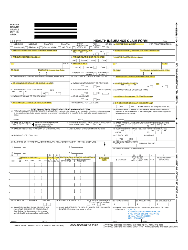 CARRIERPLEASE DO NOT STAPLE IN THIS AREAHEALTH INSURANCE CLAIM FORM MEDICAIDCHAMPUSGROUP HEALTH PLAN (SSN or ID)CHAM PVA(Medicare #) (Medicaid #) (Sponsors SSN) (VA File #) 2. PATIENTS NAME (Last