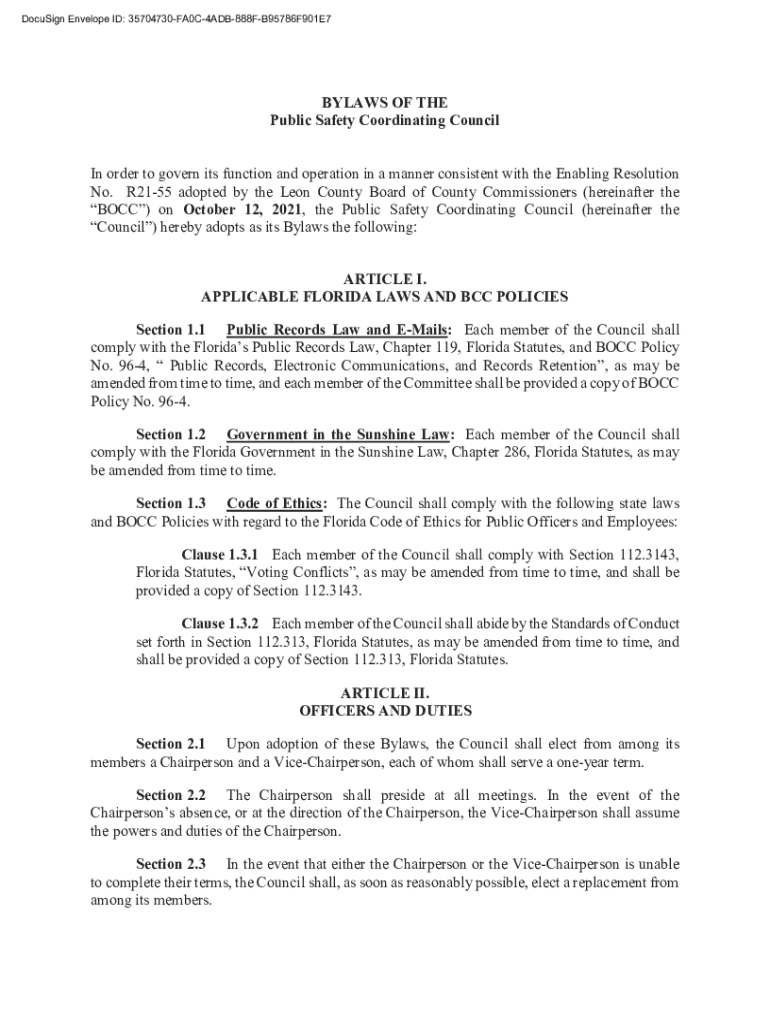 BYLAWS OF THE Public Safety Coordinating Council In order to govern its function and operation in a manner consistent with the Enabling Resolution No. R2155 adopted by the Leon County Board of County