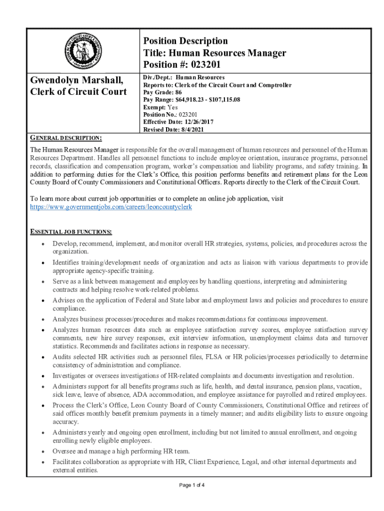 Position Description Title: Human Resources Manager Position #: 023201 Gwendolyn Marshall, Clerk of Circuit CourtGENERAL DESCRIPTION:Div./Dept.: Human Resources Reports to: Clerk of the Circuit Court
