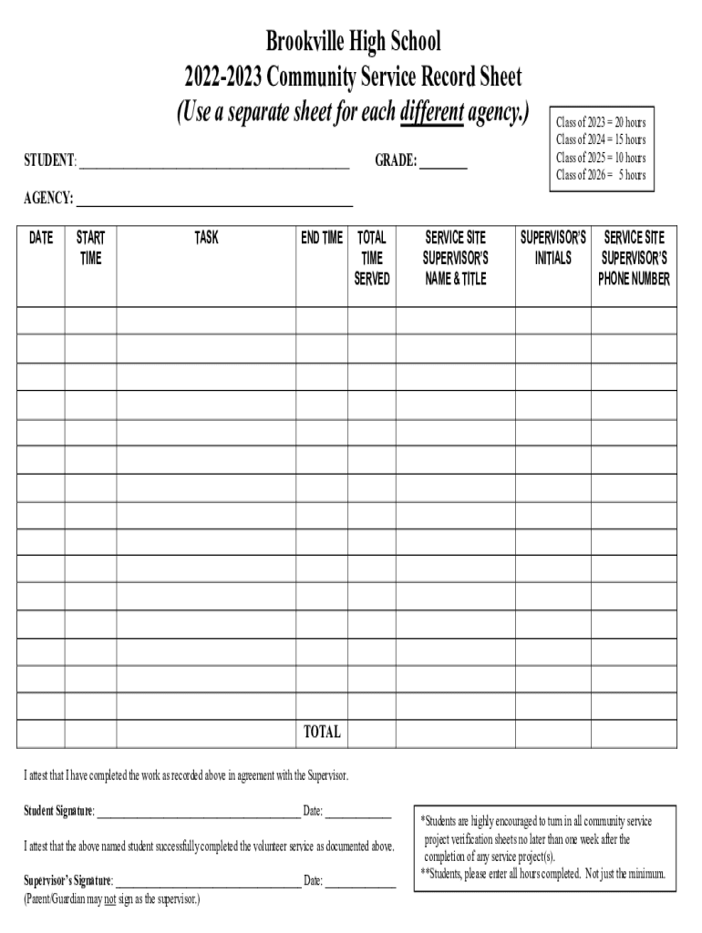 Brookville High School 20222023 Community Service Record Sheet (Use a separate sheet for each different agency.) STUDENT: ___GRADE: ___Class of 2023 20 hours Class of 2024 15 hours Class of 2025 10