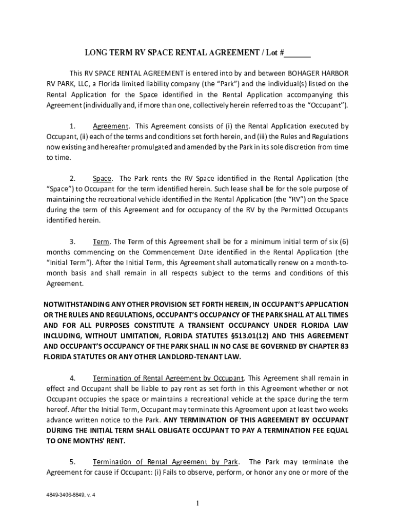 LONG TERM RV SPACE RENTAL AGREEMENT / Lot #___ This RV SPACE RENTAL AGREEMENT is entered into by and between VOYAGER HARBOR RV PARK, LLC, a Florida limited liability company (the Park) and the individual(s)