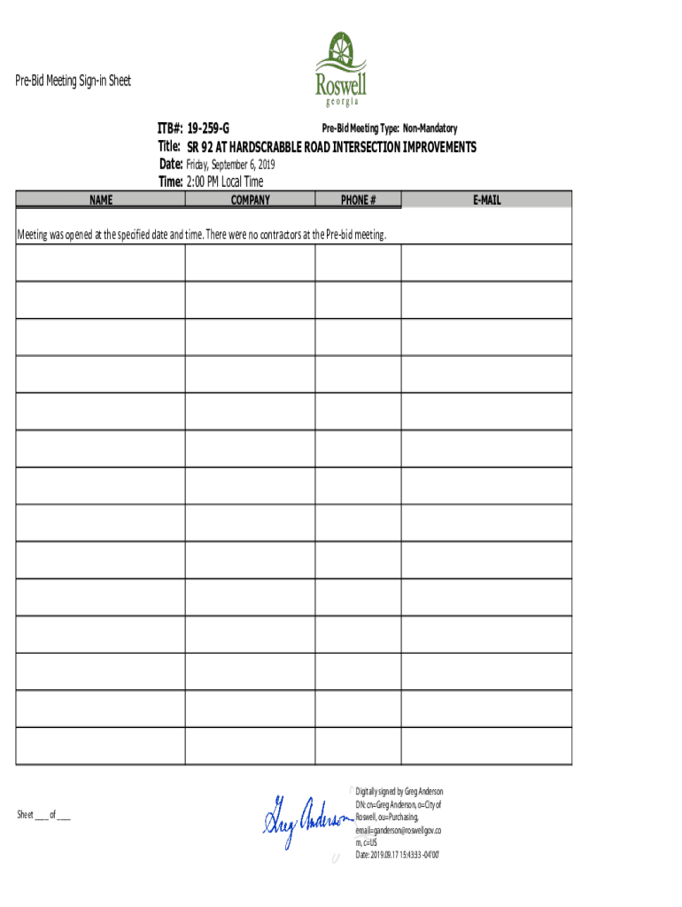 PreBid Meeting Signing Sheet ITB#: Title: Date: Time: NAMEPreBid Meeting Type: NonMandatory 19259G SR 92 AT HARDSCRABBLE ROAD INTERSECTION IMPROVEMENTS Friday, September 6, 20192:00 PM Local Time