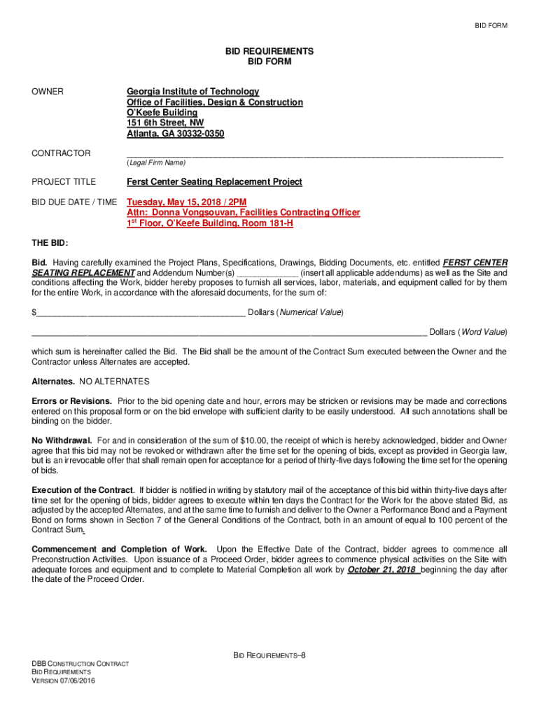 BID FORBID REQUIREMENTS BID FORM OWNER Georgia Institute of Technology Office of Facilities, Design & Construction O'Keefe Building 151 6th Street, NW Atlanta, GA 303320350CONTRACTOR___ (Legal Firm