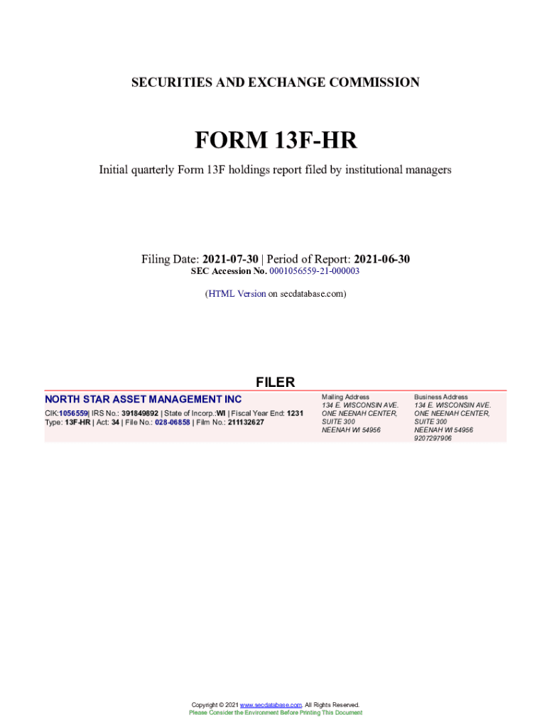 Get the free NORTH STAR ASSET MANAGEMENT INC Form 13F-HR Filed 2021-07-30. Accession Number